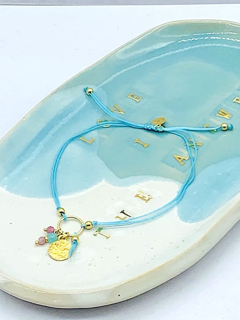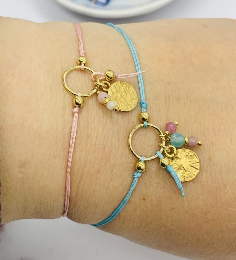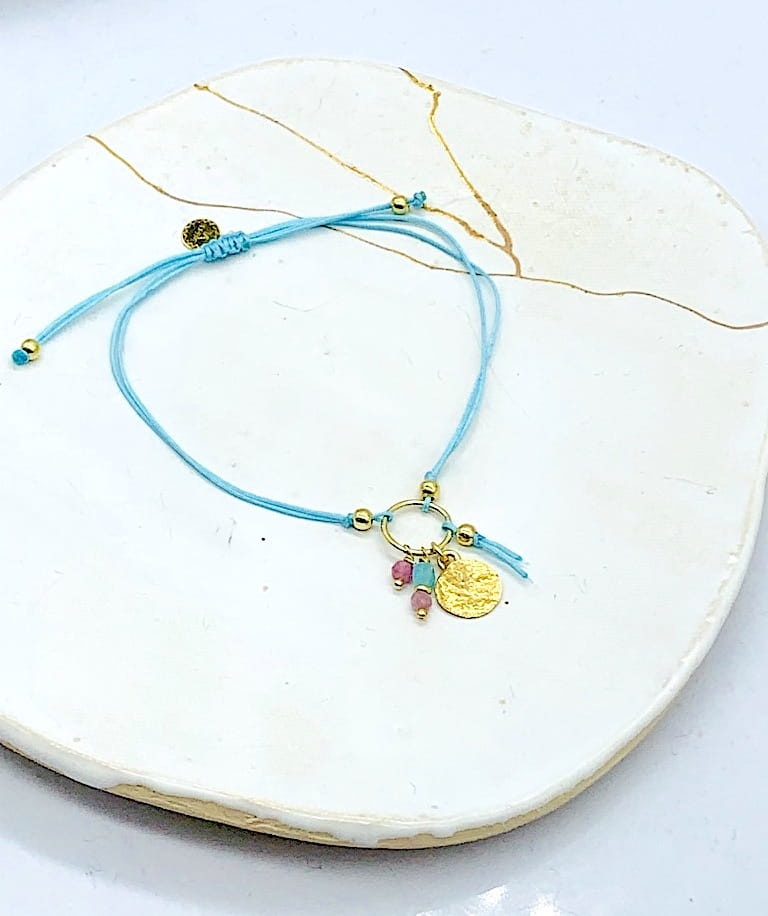 Bransoletka na nylonowej niteczce ze srebrnym kółeczkiem i podwiewszoną blaszką fakturowaną i kamieniami. Kółeczko średnica 10mm, blaszka średnia 8x10mm