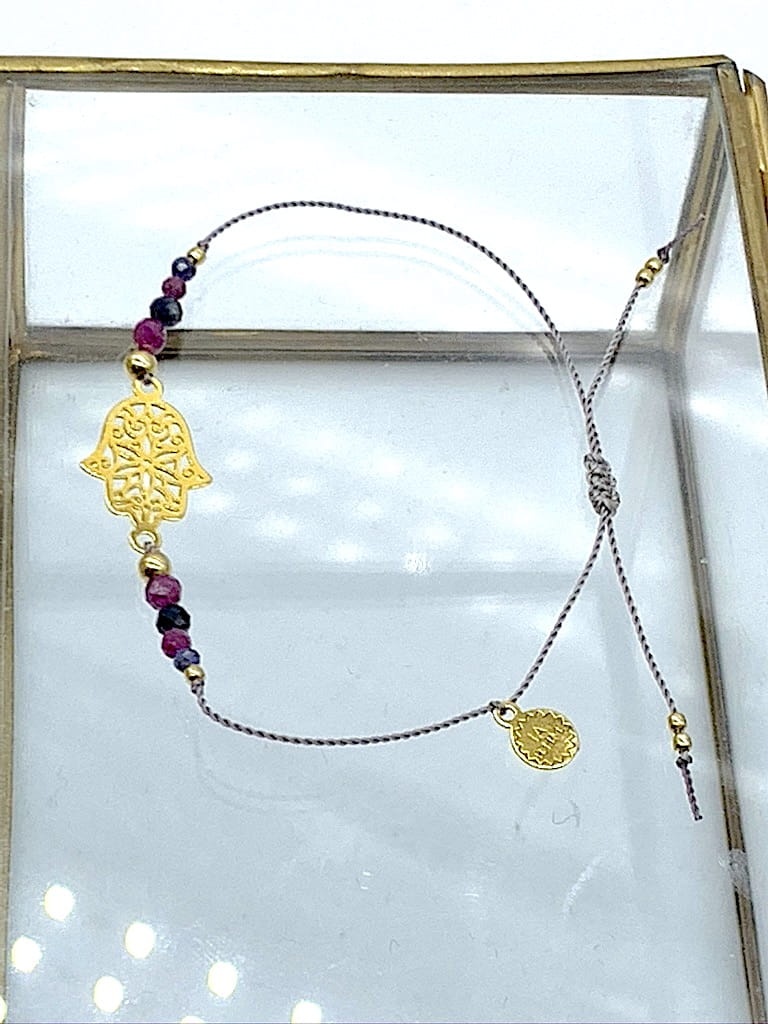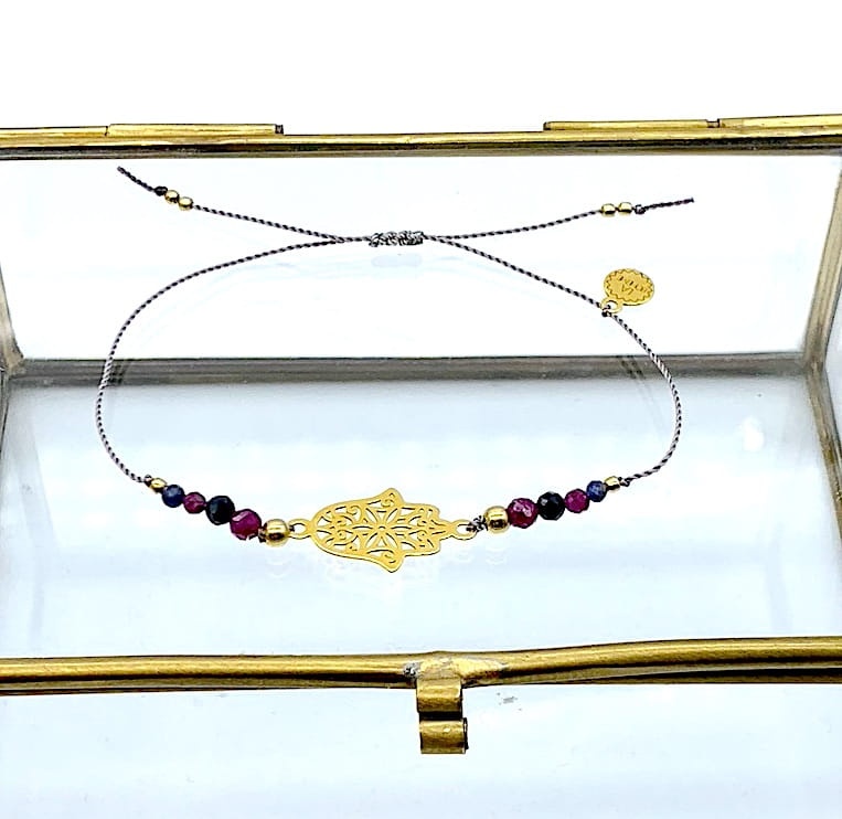 Bransoletka Naturalność Hamsa Dłoń Fatimy Opatrzności szafiry rubiny szary złocona
