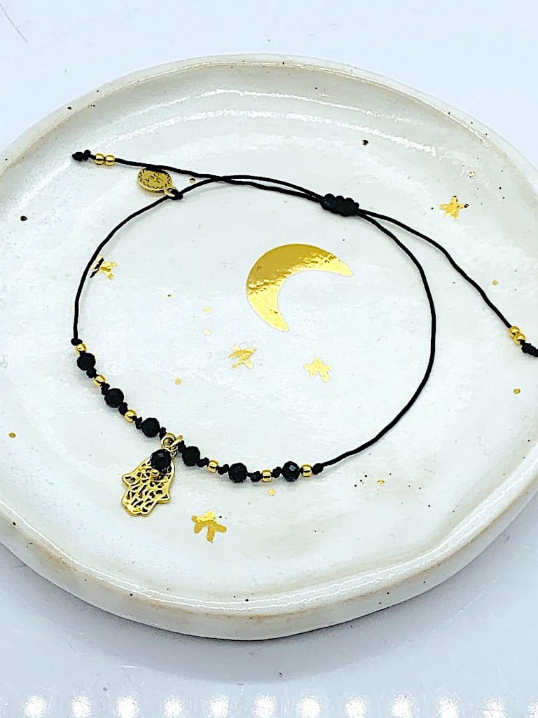 Bransoletka Naturalność czarny turmalin supełkowana zawieszka Hamsa Dłoń Fatimy złocona