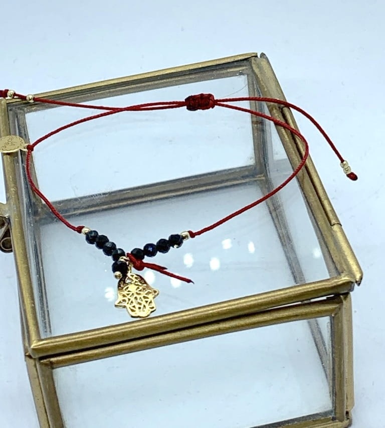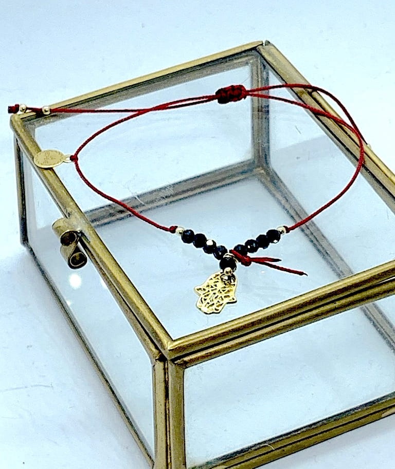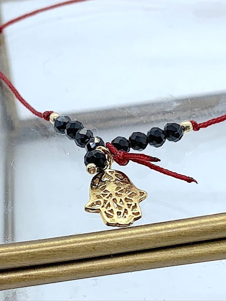 Bransoletka Naturalność czarny turmalin zawieszka Hamsa Dłoń Fatimy niteczka złocona