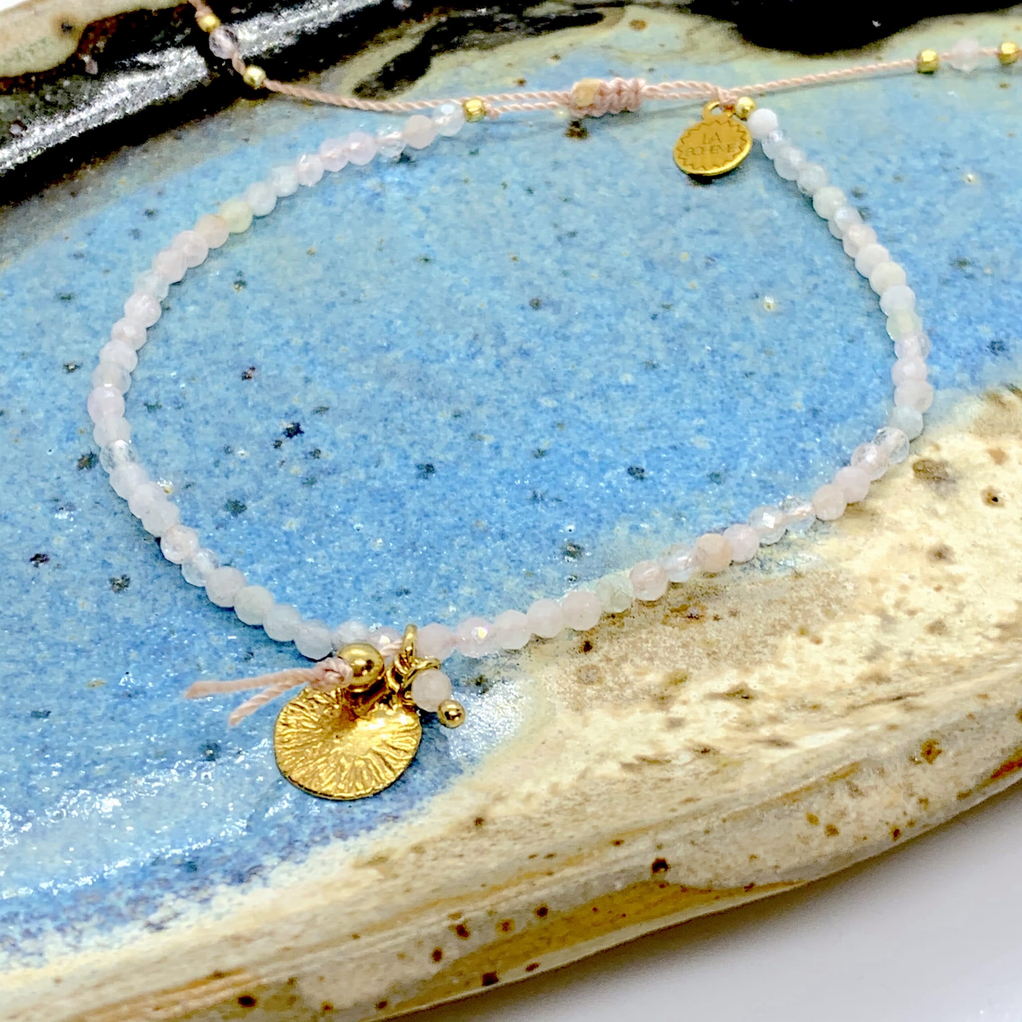 Bransoletka z kolekcji Naturalność z kamienia naturalnych na nylonowej niteczce z zawieszką w kaształcie blaszki.