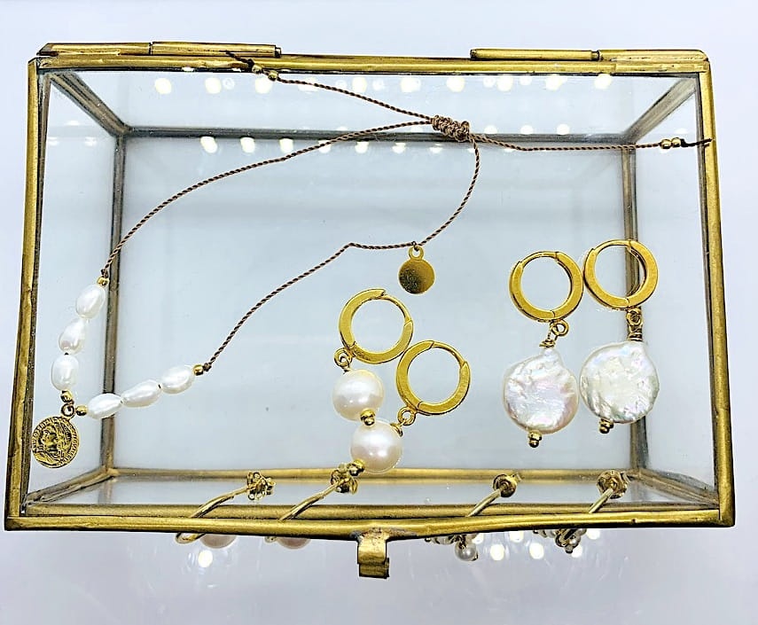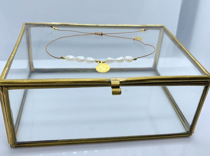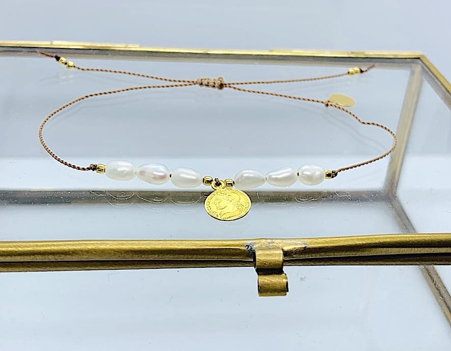 Bransoletka z Kolekcji „ Naturalność” .Sześć perełek i zawieszona monetka  Mocny nylonowy sznureczek. Regulowana dzięki zapięciu splot makramy.