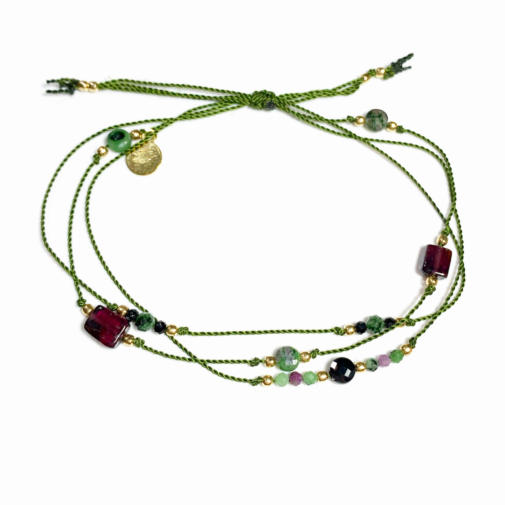 Bransoletka Naturalność potrójna granaty i zoisyt z rubinem złocona