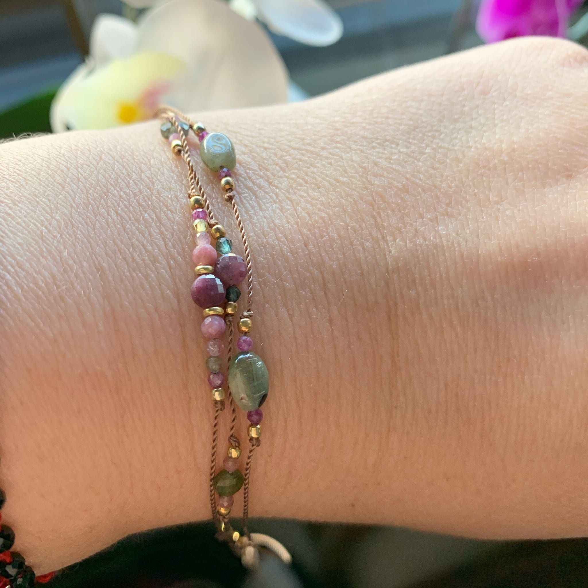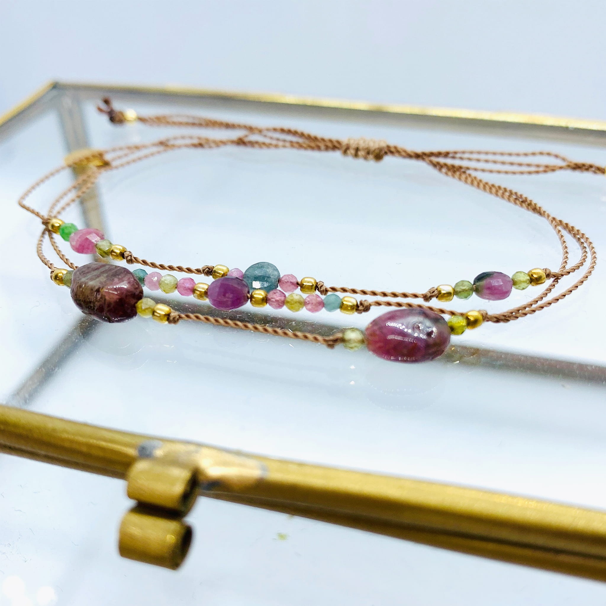 Bransoletka Naturalność potrójna turmaliny i rubiny złocona