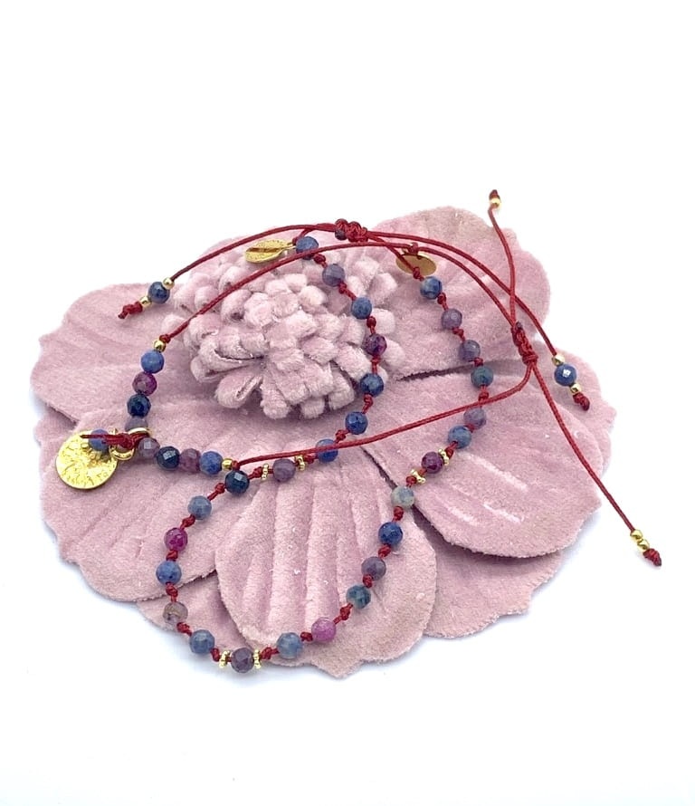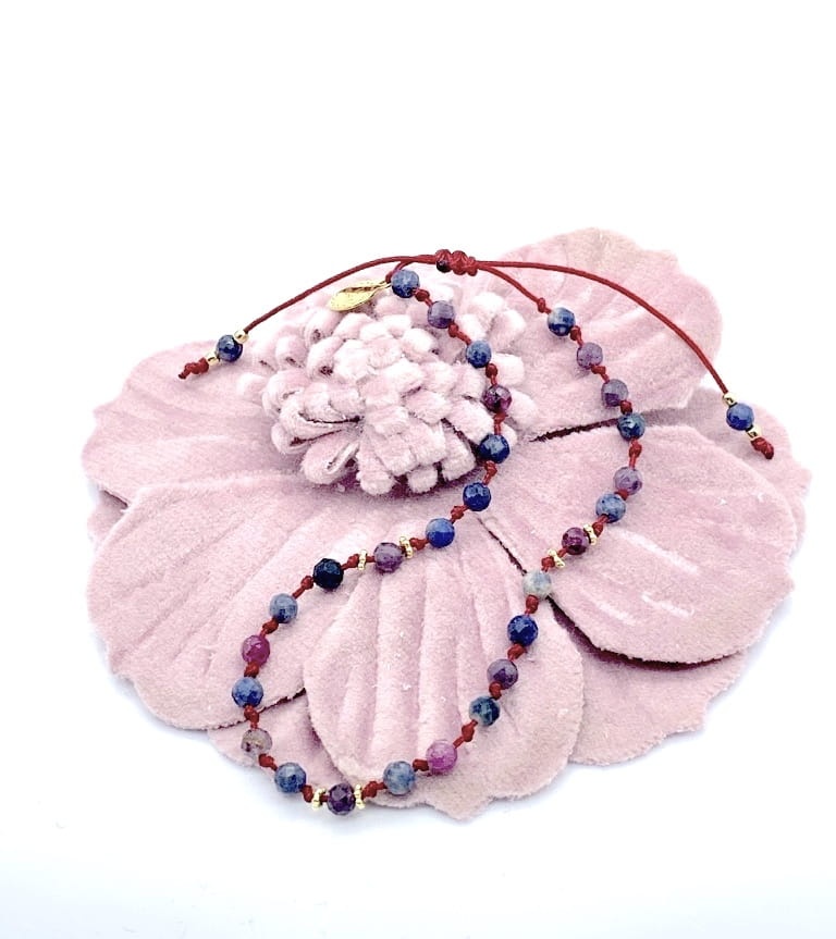 Bransoletka Naturalność szafiry rubiny supełkowana bordowa złota