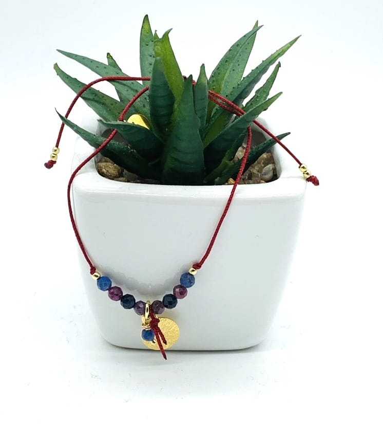 Bransoletka Naturalność szafiry z rubinami zawieszka blaszka niteczka złocona