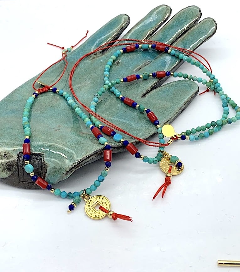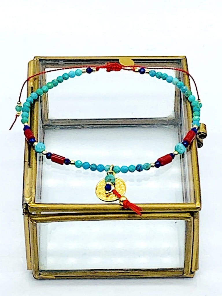Bransoletka Naturalność turkus koral lapis Chińska Moneta złota