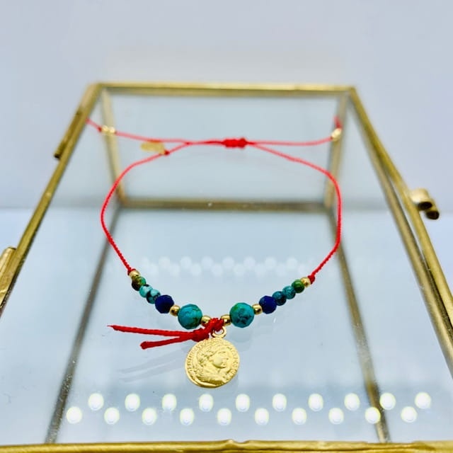 Bransoletka Naturalność turkusy monetka czerwona złocone