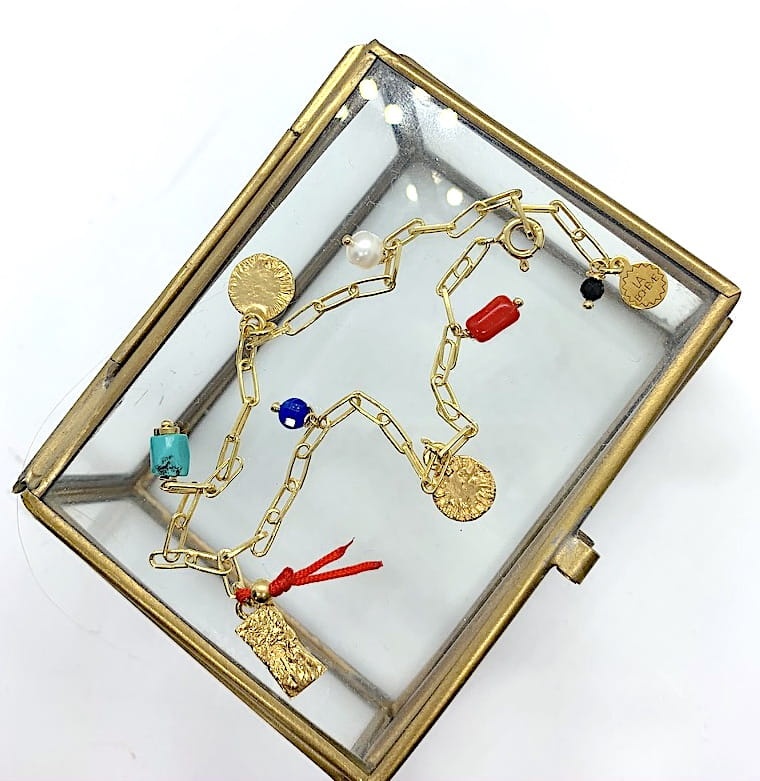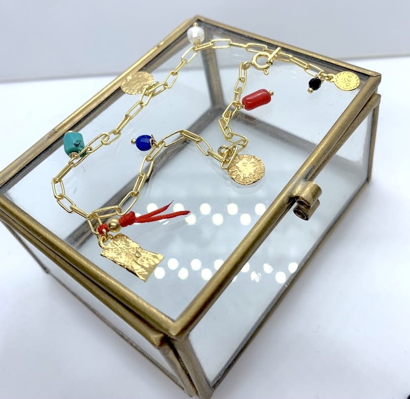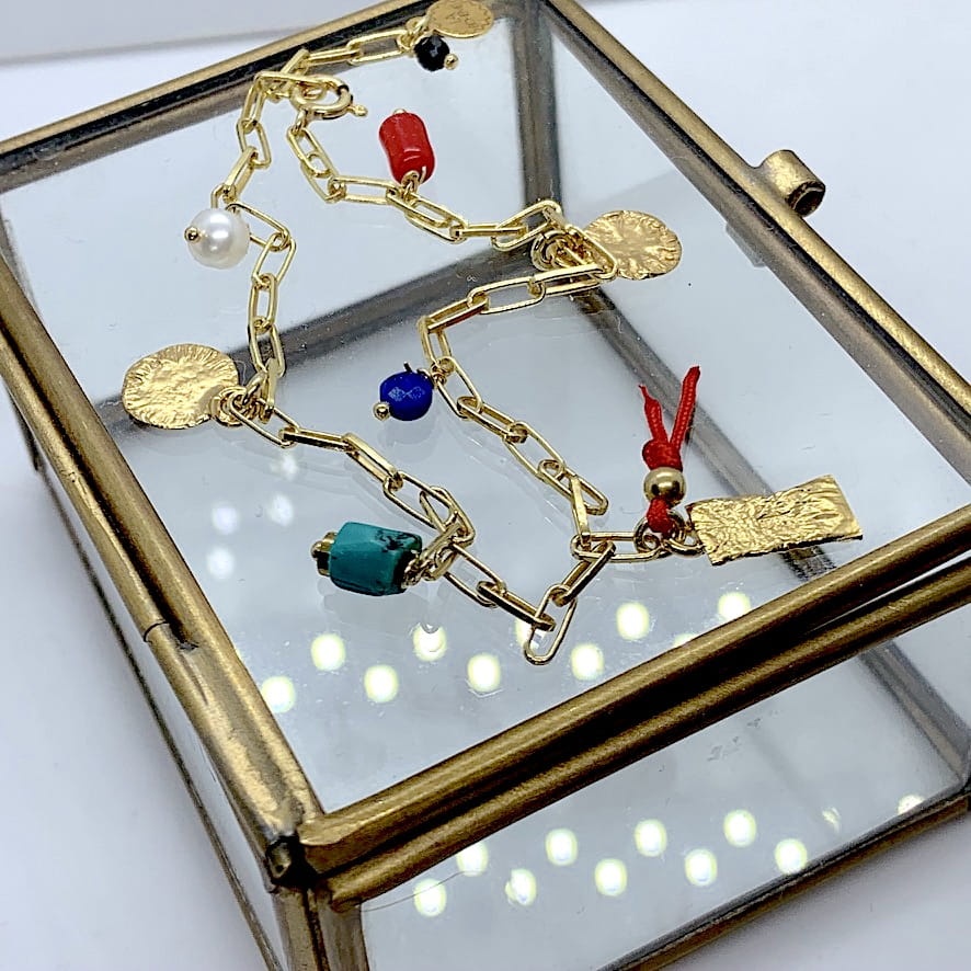 Bransoletka grubszy łańcuszek z blaszkami i kamieniami turkus koral perła pozłacany