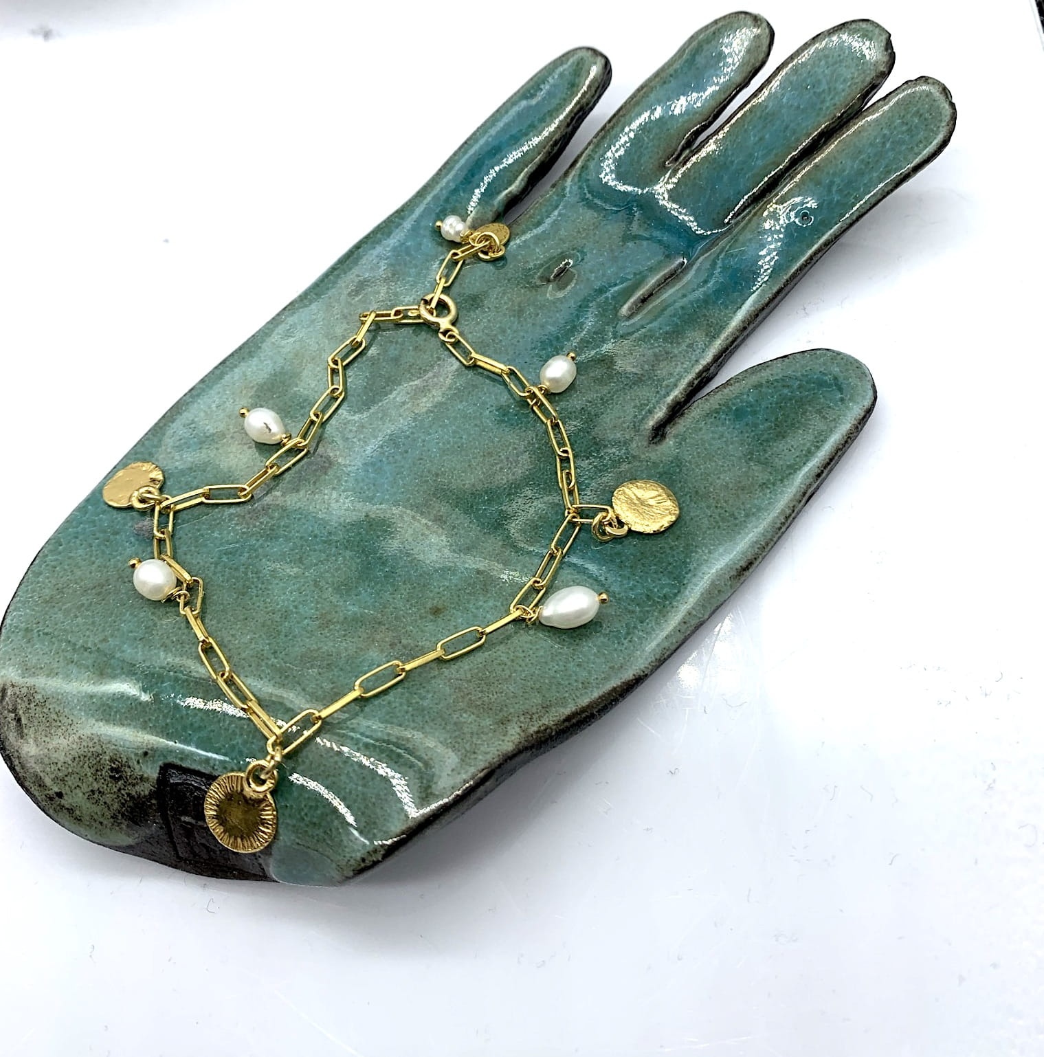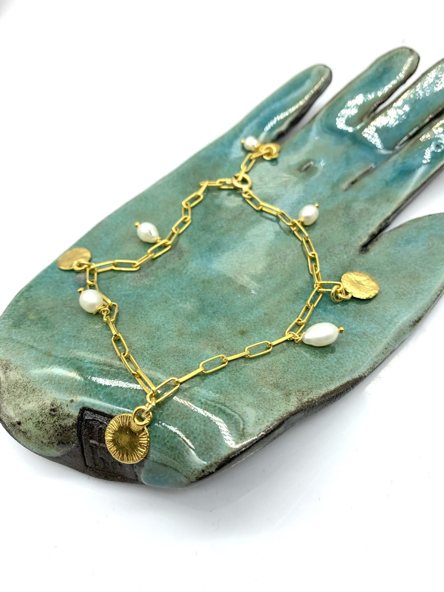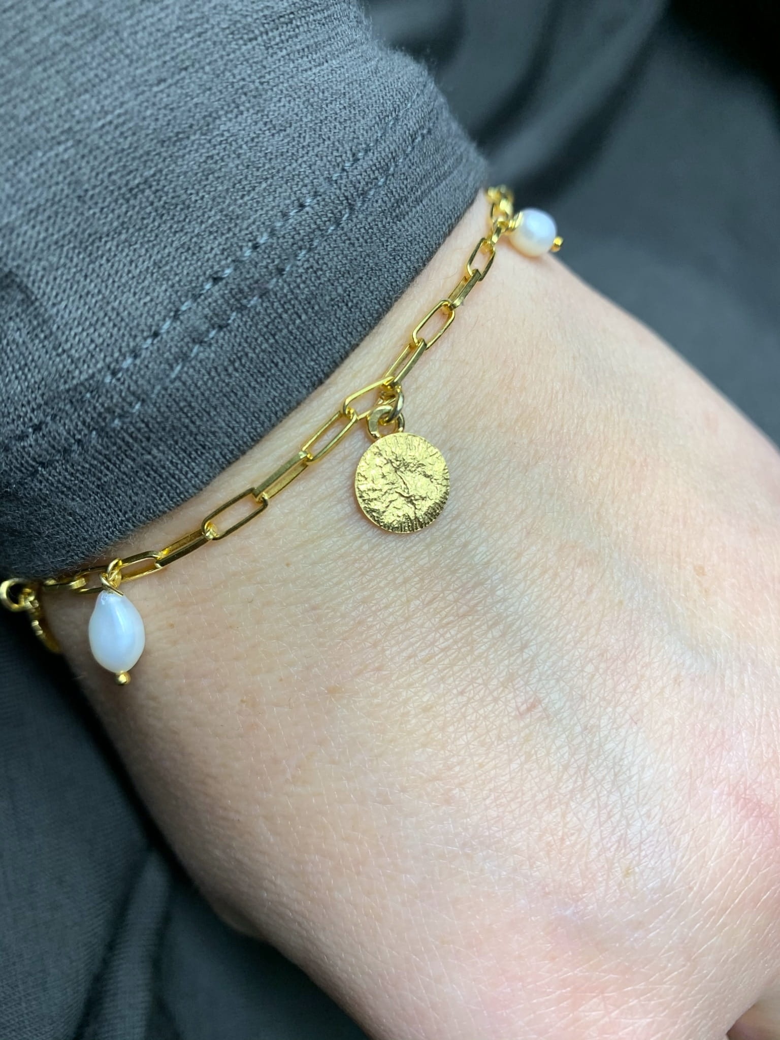 Bransoletka grubszy łańcuszek z blaszkami i perłami perły pozłacany