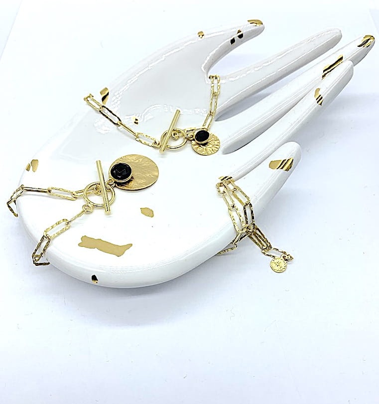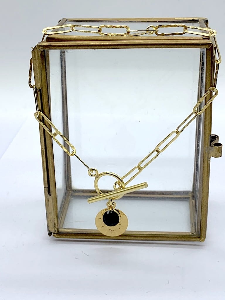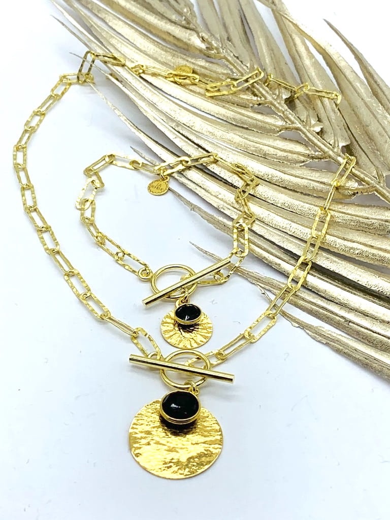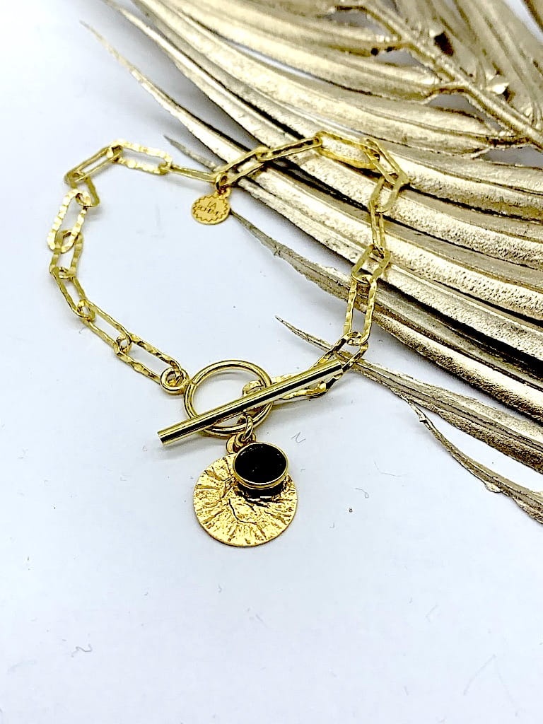 Bransoletka gruby łańcuch z młotkowaną blaszką i onyksem złocony