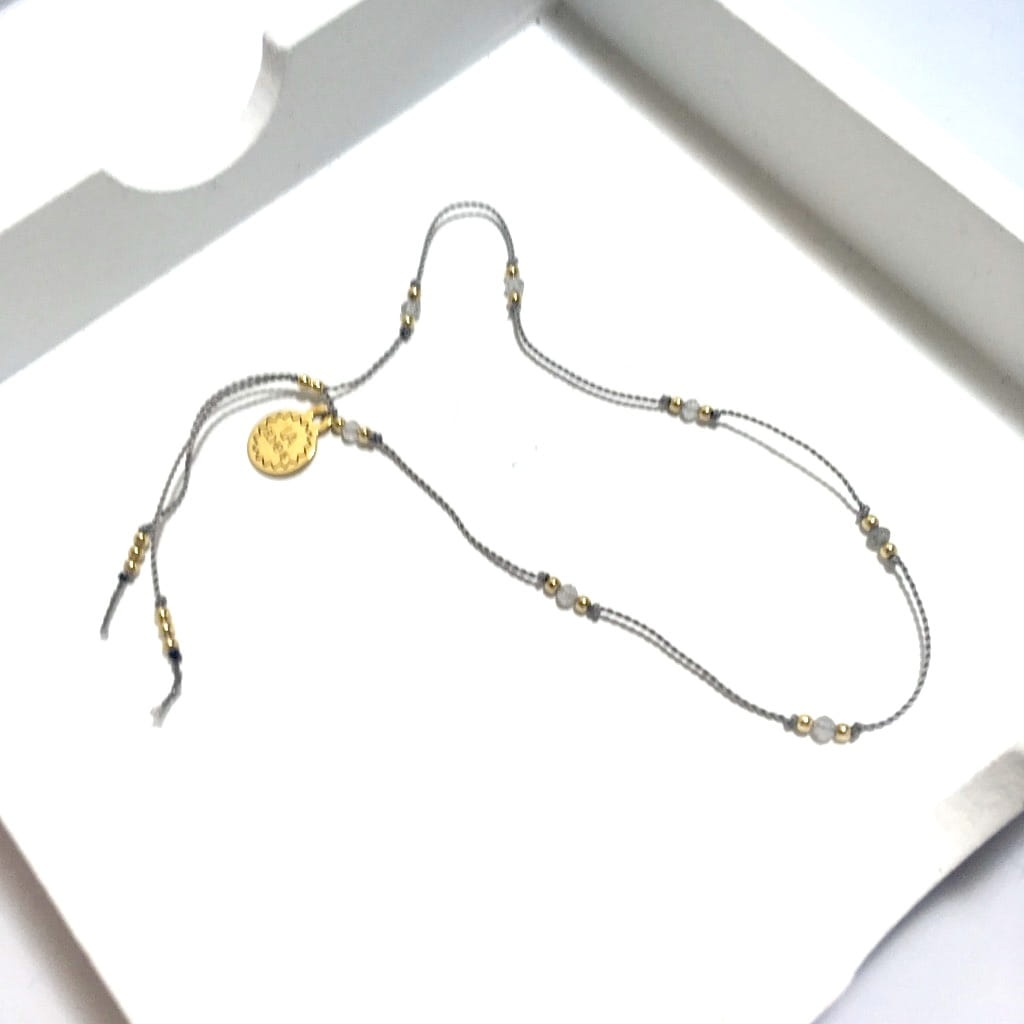 Bransoletka z kamieni naturalnych nawleczonych na sznureczek wykończona srebrną blaszką z logo La Boheme. Zapięcie - sznureczki przeciągane przez srebrną kuleczkę.