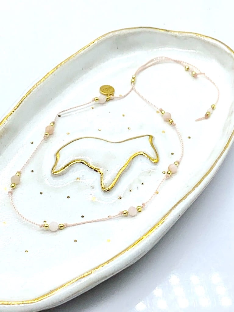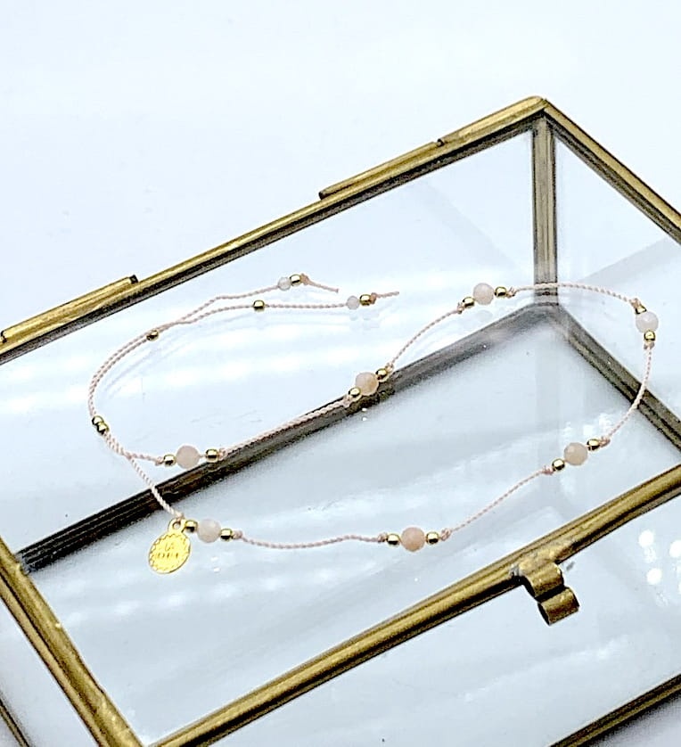 Bransoletka z kamieni naturalnych nawleczonych na sznureczek wykończona srebrną blaszką z logo La Boheme. Zapięcie - sznureczki przeciągane przez srebrną kuleczkę lub makrama do wyboru.