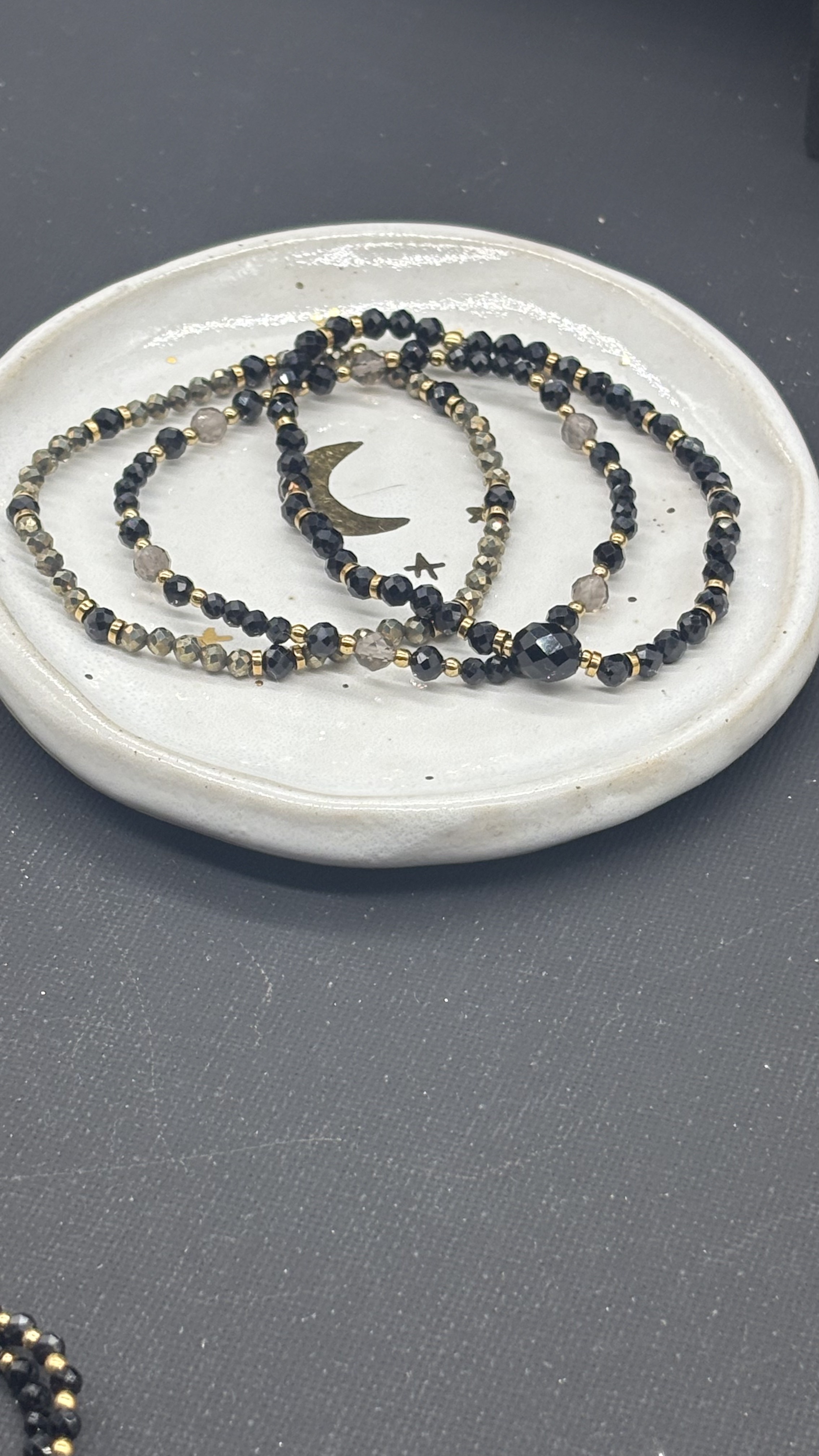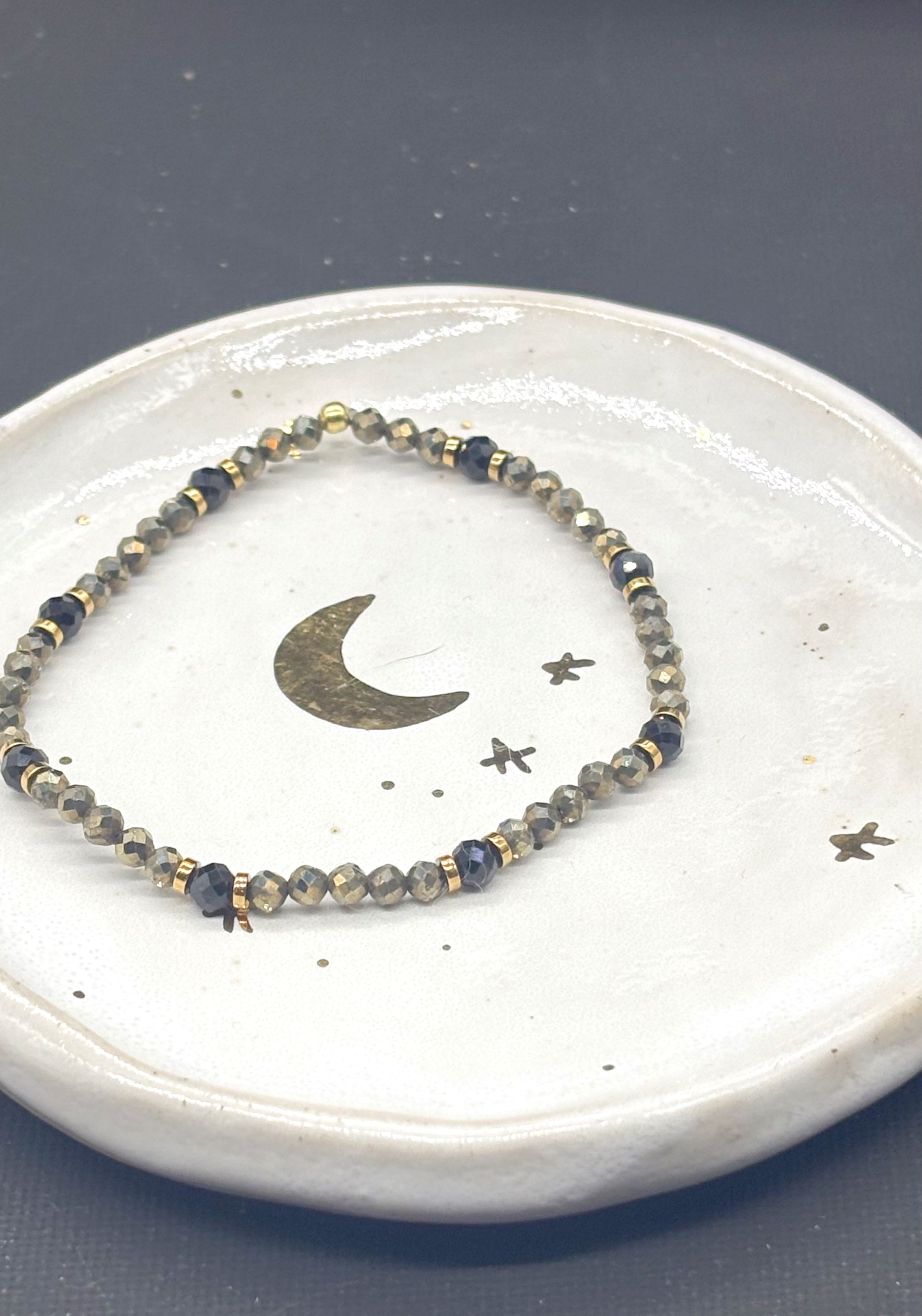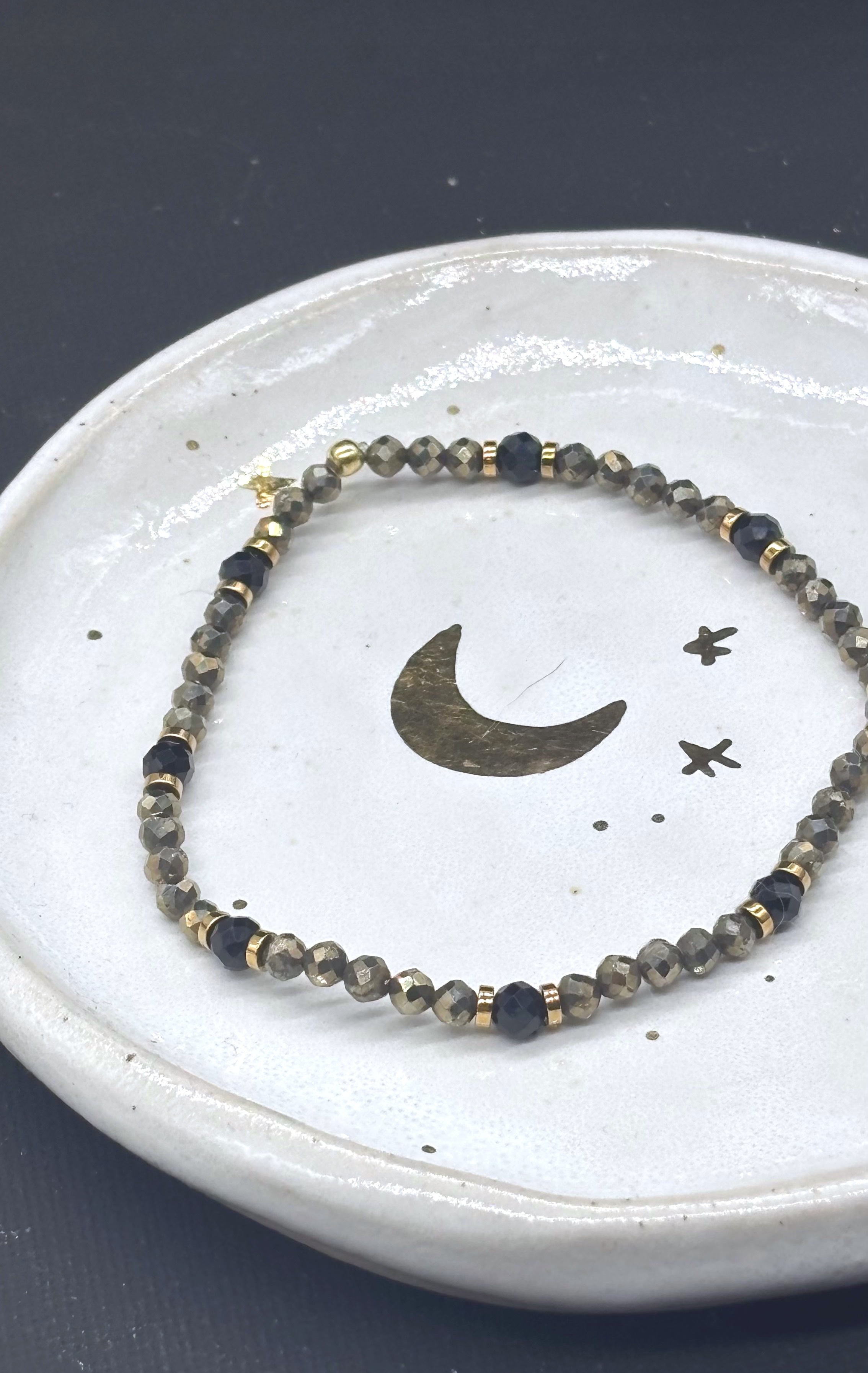 Bransoletka piryt czarny turmalin 3mm na gumkę złocona