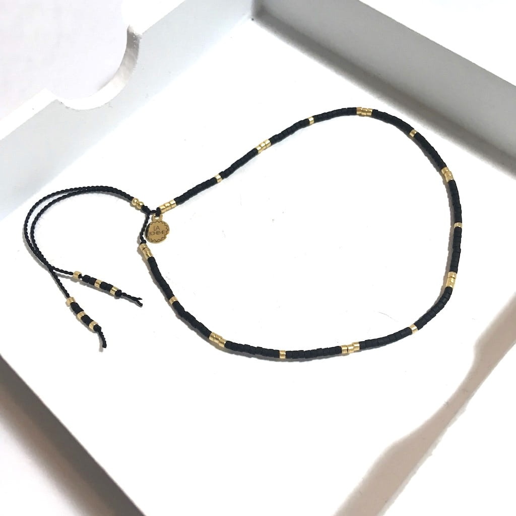 Bransoletka ze szkła japońskiego nawleczona na sznureczke wykończona srebrną blaszką z logo La Boheme. Zapięcie - sznureczki przeciągane przez srebrną kuleczkę.