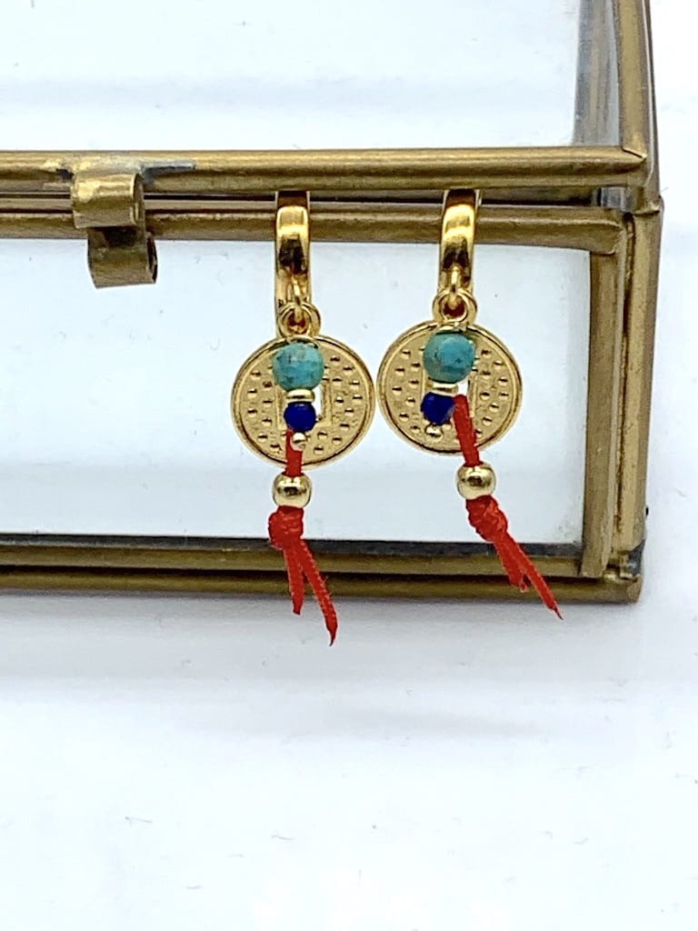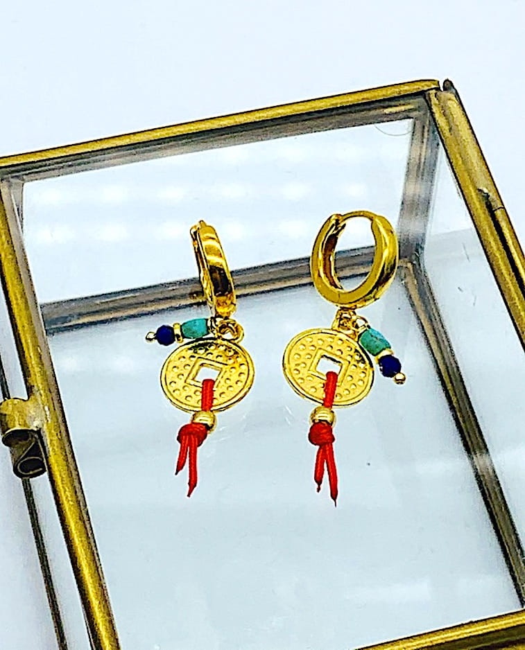 Kolczyki grube kajdanki Chińska Moneta na szczęście turkus złocone