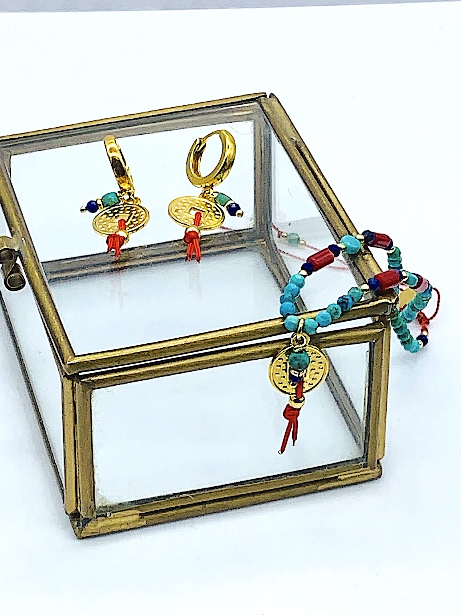 Kolczyki kajdanki z zawieszką odzwierciadlającą chińską monetę zdowieszonymi naturalnymi kamieniami