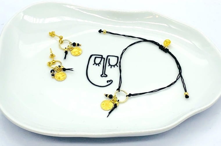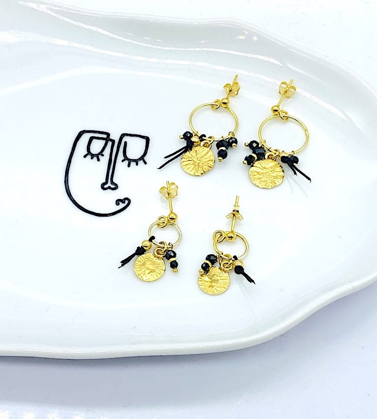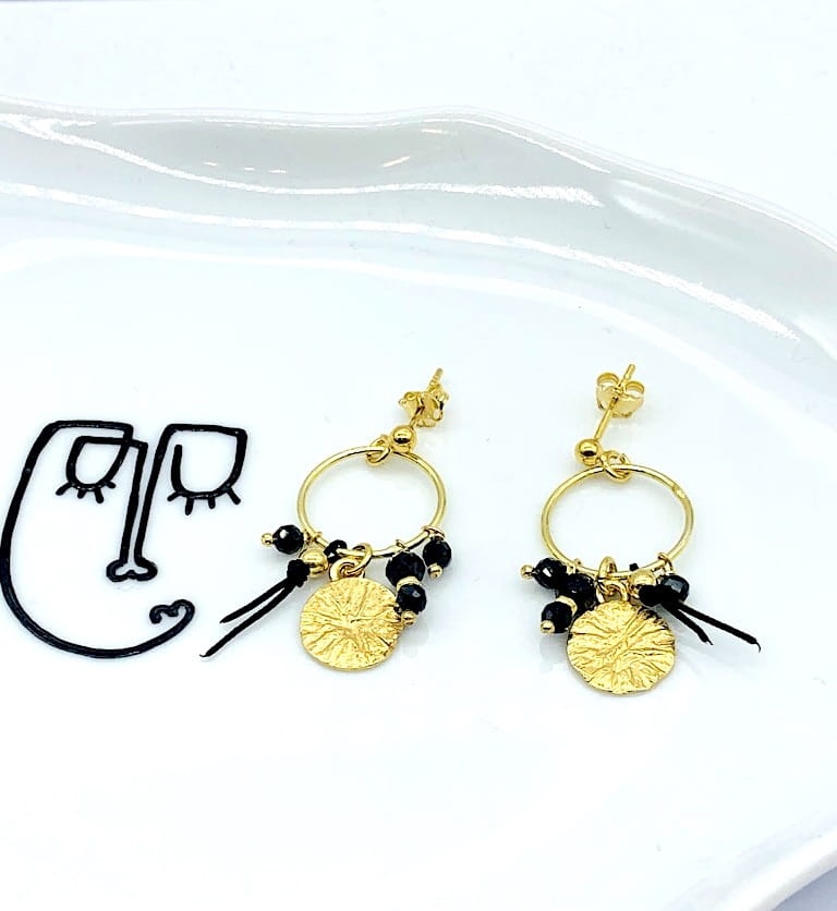 Kolczyki koła 15mm sztyft boho czarny turmalin blaszka niteczka czarna złocona