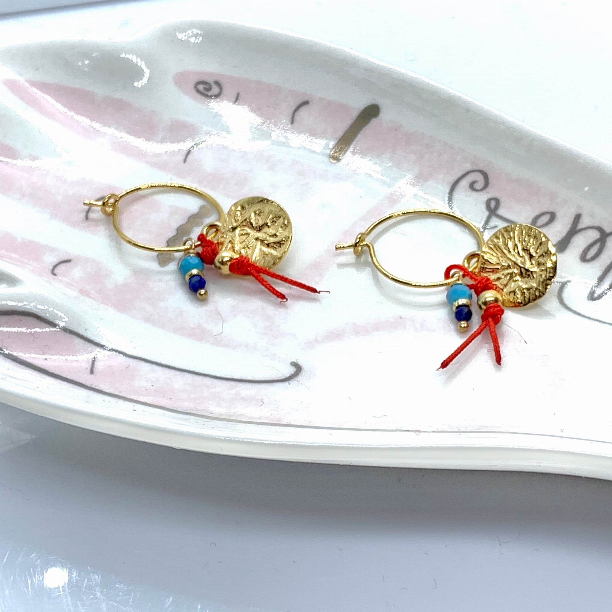 Kolczyki koła mini na haczyk boho blaszka niteczka czerwona złocona