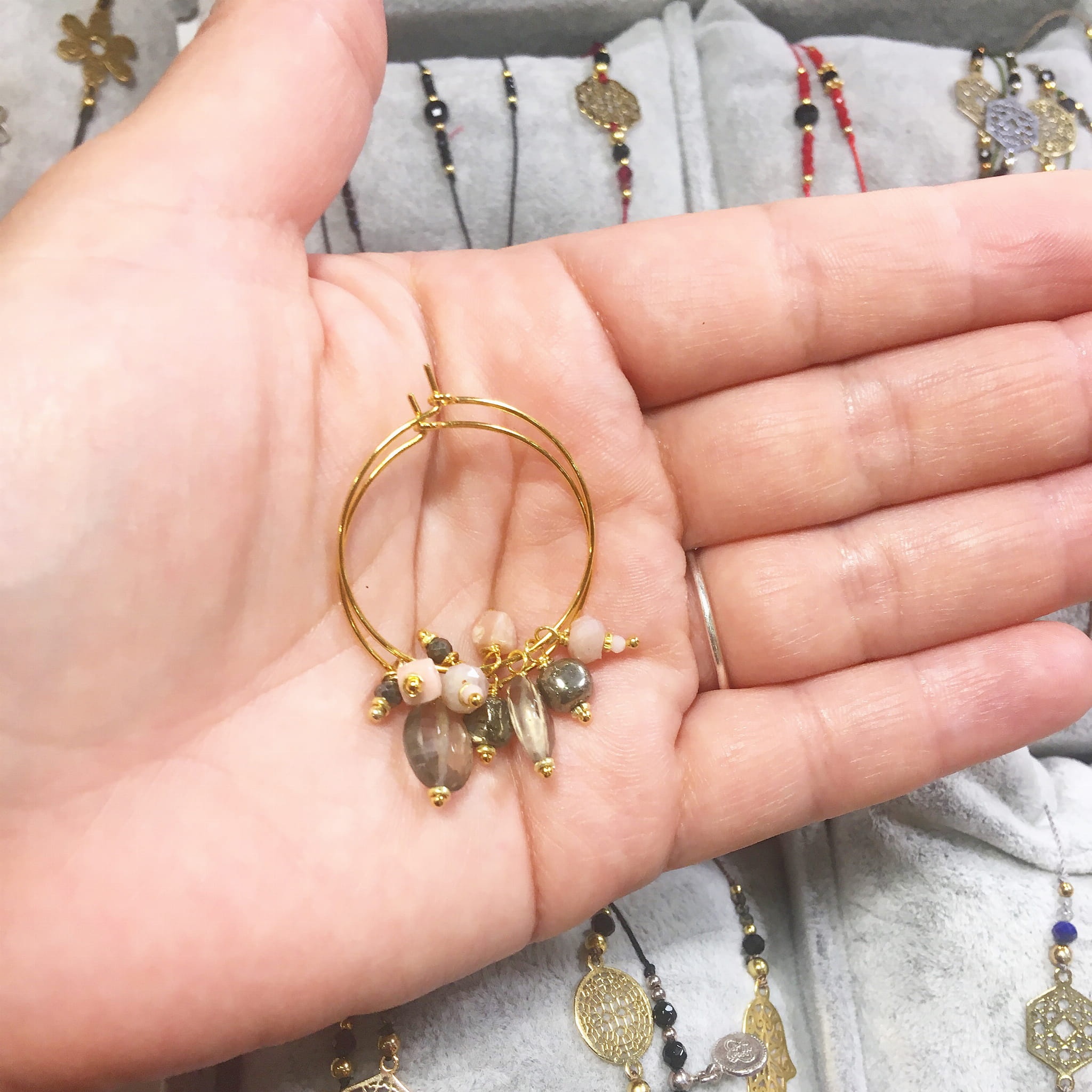 Kolczyki koła ze zdejmowani zawieszkami z naturalnych kamieni Kolczyki występuję w wersji srebrnej i złotej. Możliwość wymiany zawieszek.