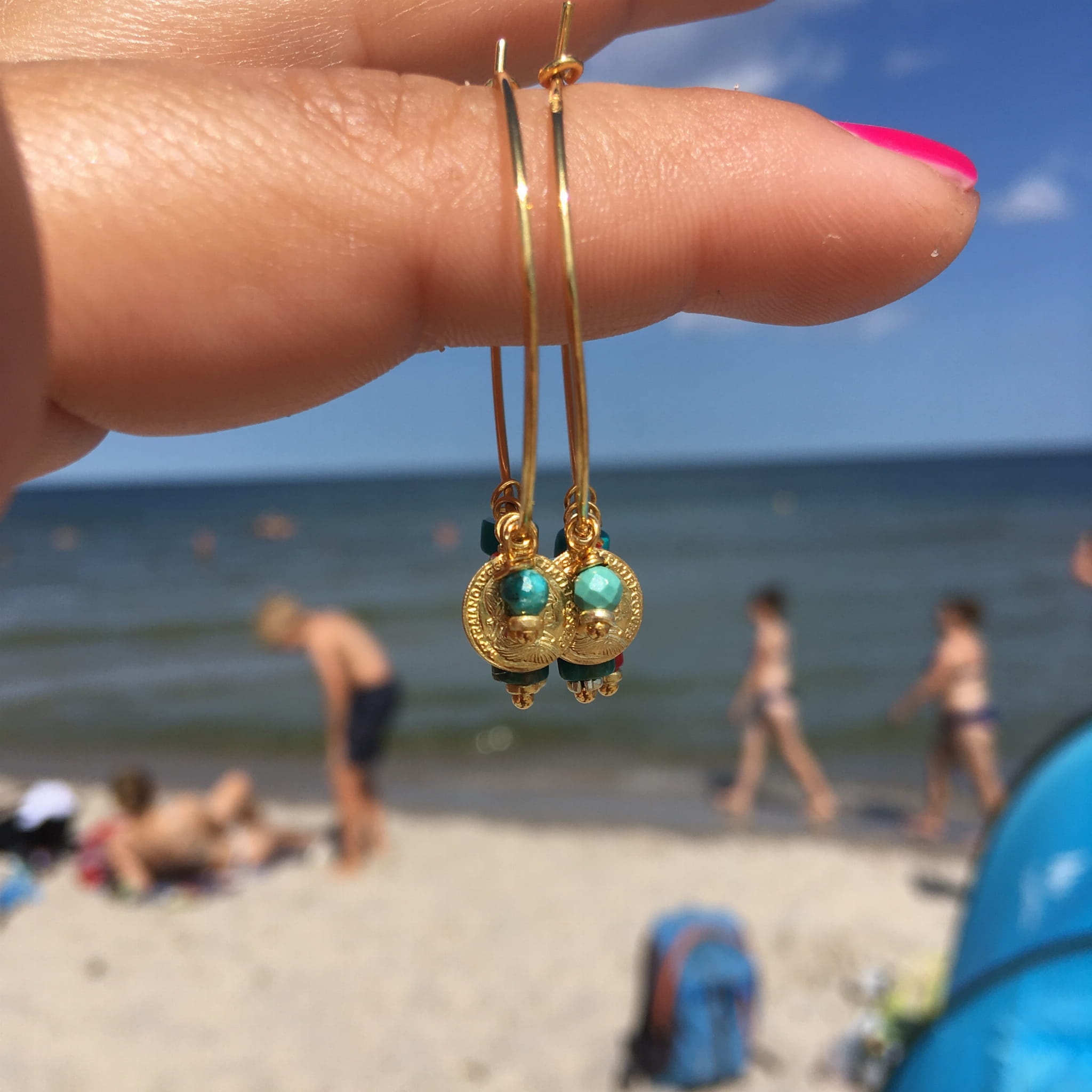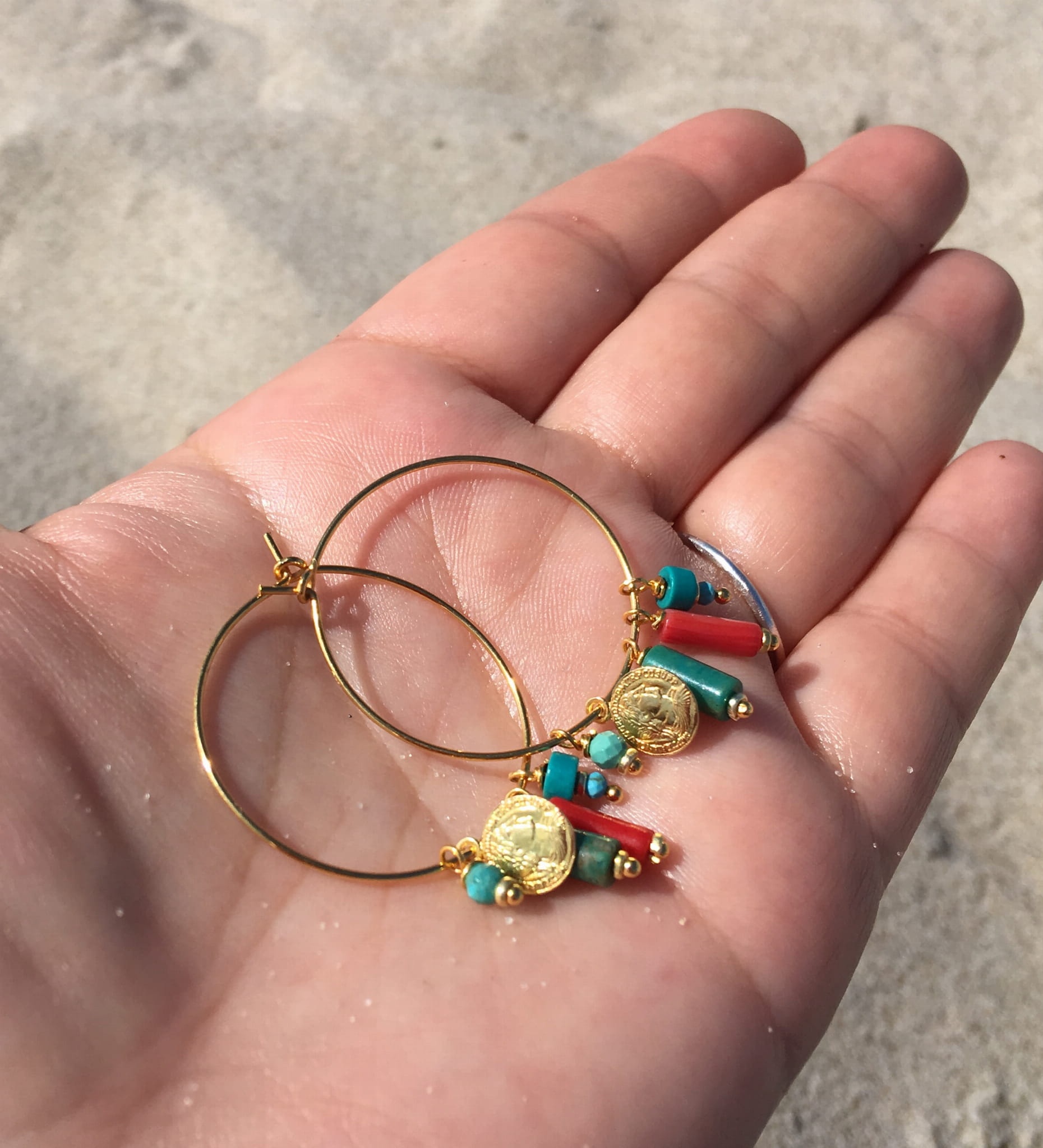 Kolczyki koła na haczyk z turkusem, koralem i monetką złoto