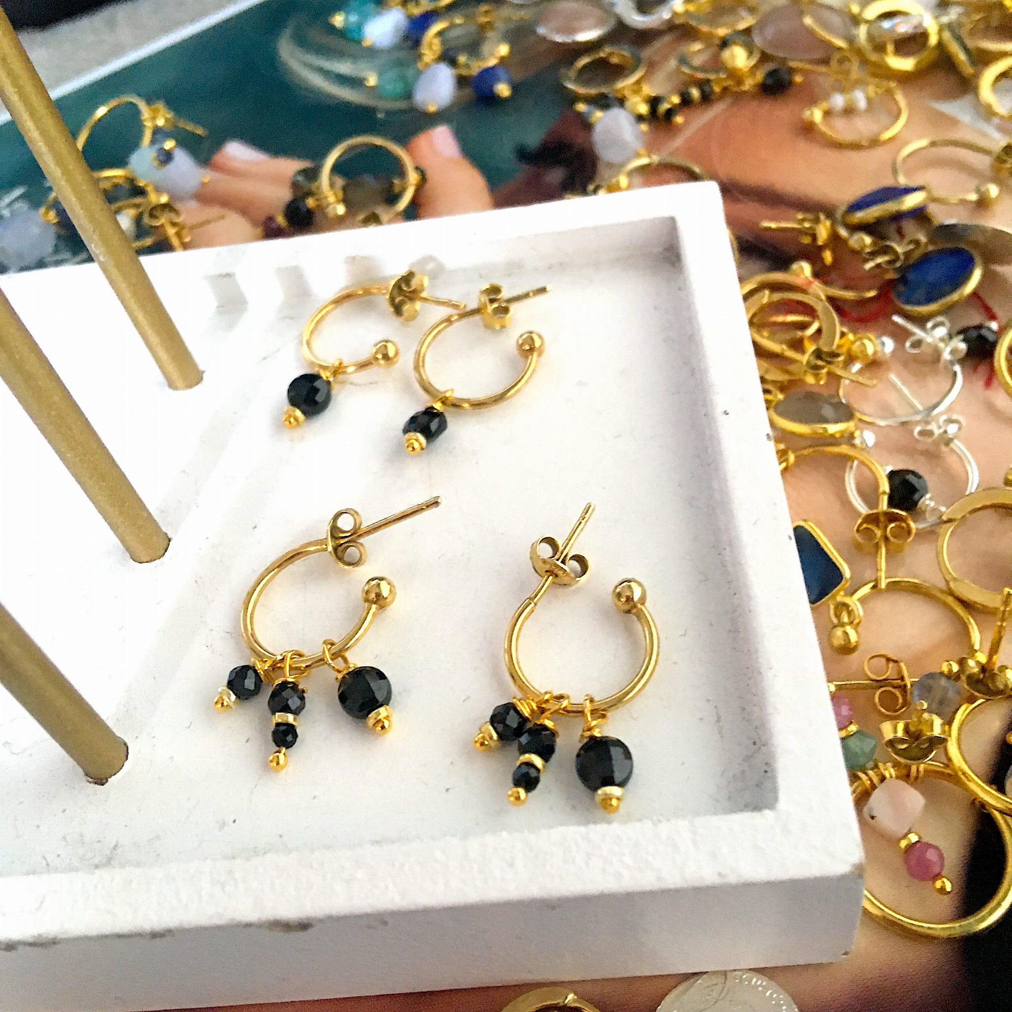 Kolczyki kółka na sztyfcie ze spinelem i czarnym turmalinem potrójne złote