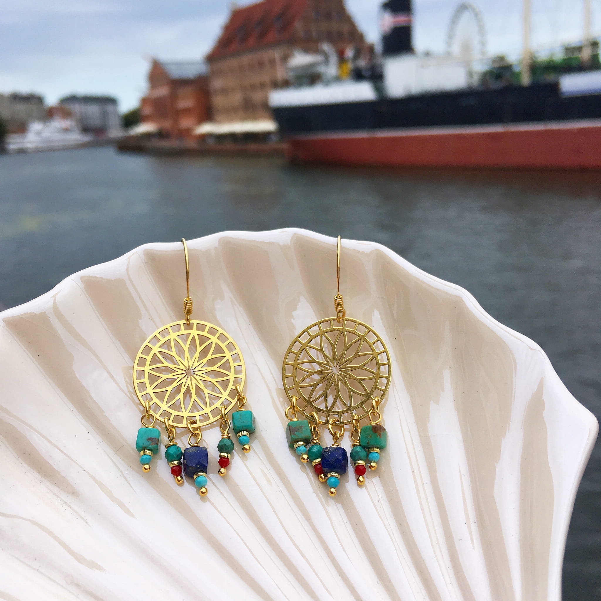 Kolczyki łapacz snów z zawieszkami z naturalnych kamieni.