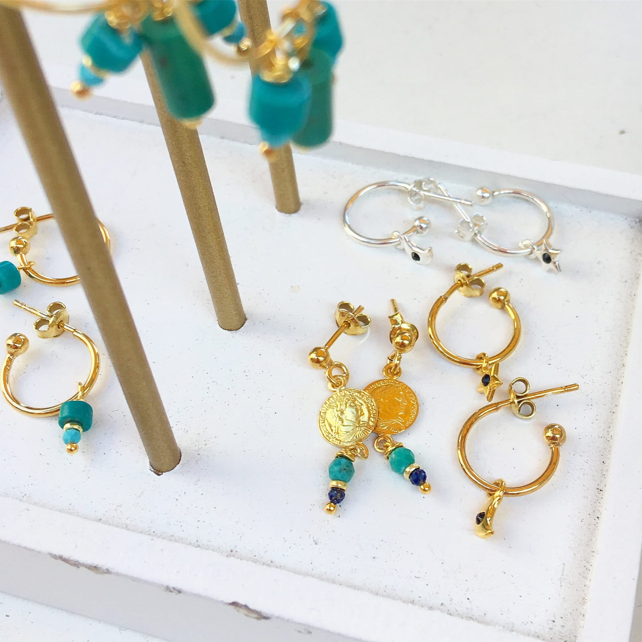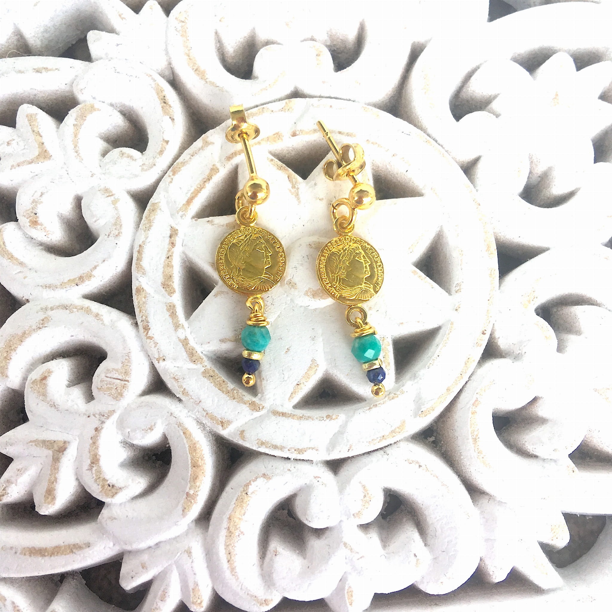 Kolczyki monetki na sztyfcie z zawieszką z naturalnych kamieni.