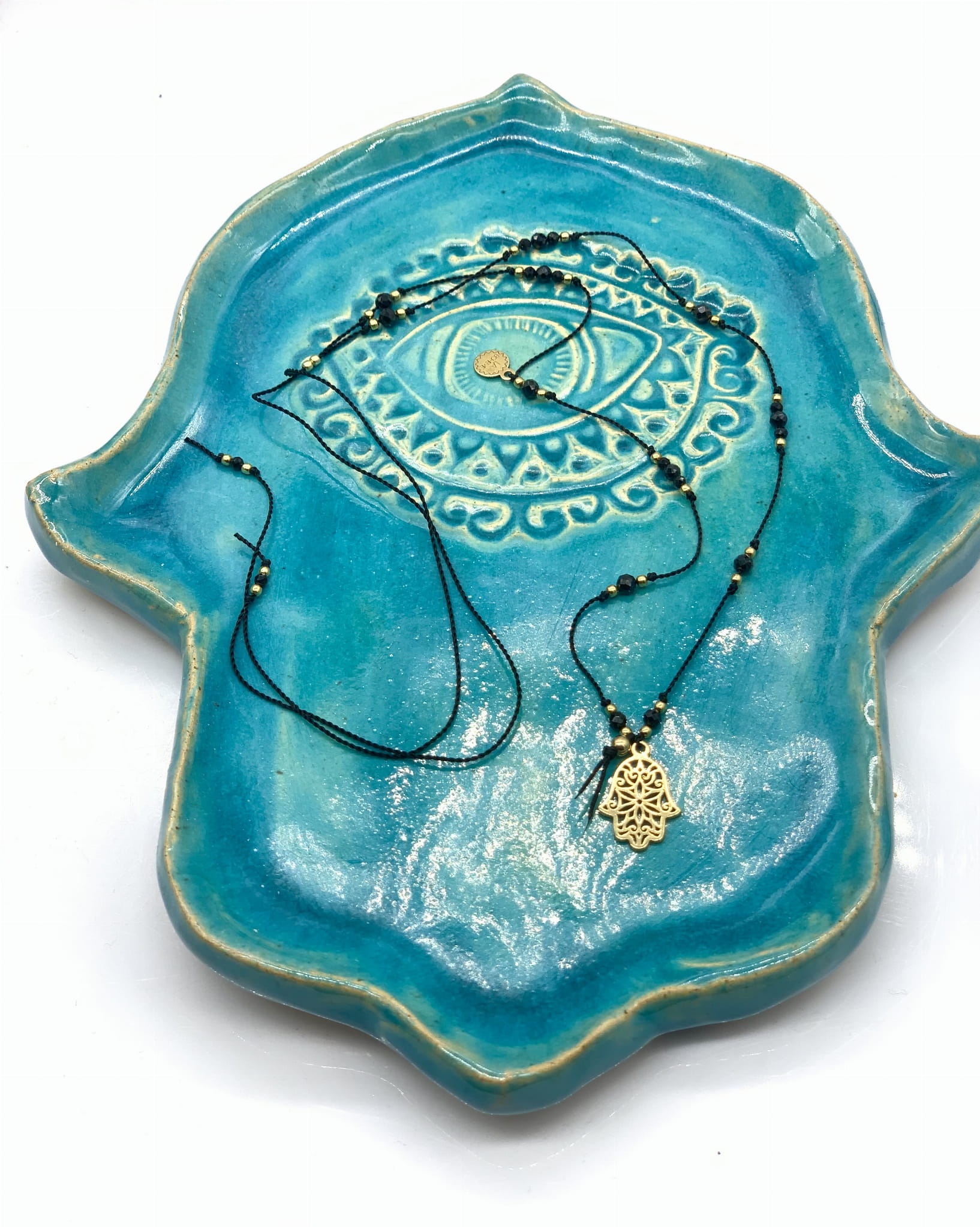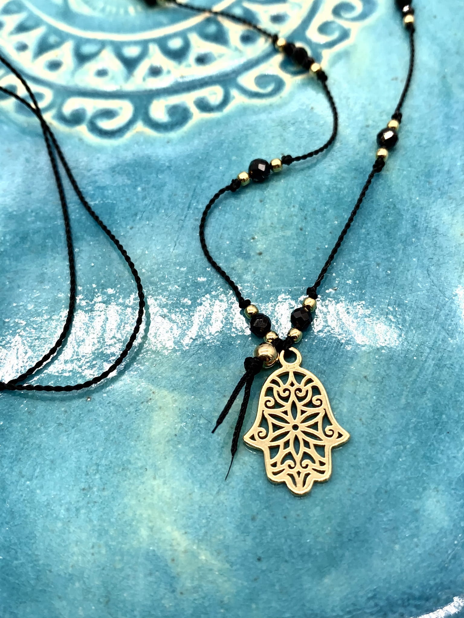 Naszyjnik Naturalność czarny turmalin Dłoń Fatimy Hamsa czarny złocona