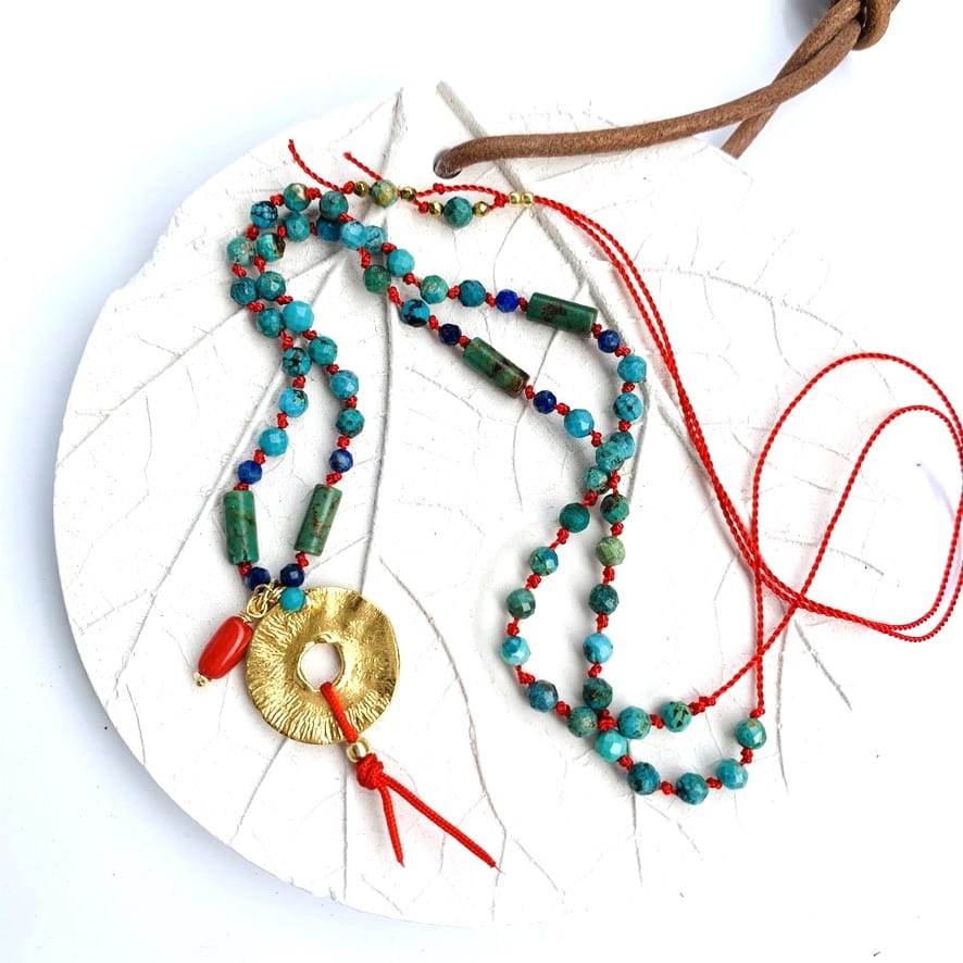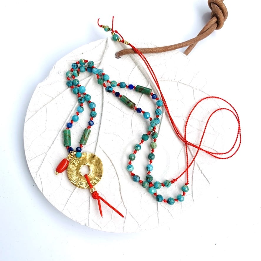 Naszyjnik Naturalność turkus lapis supełkowany 3 mm i blaszka dziurką z niteczką złoty