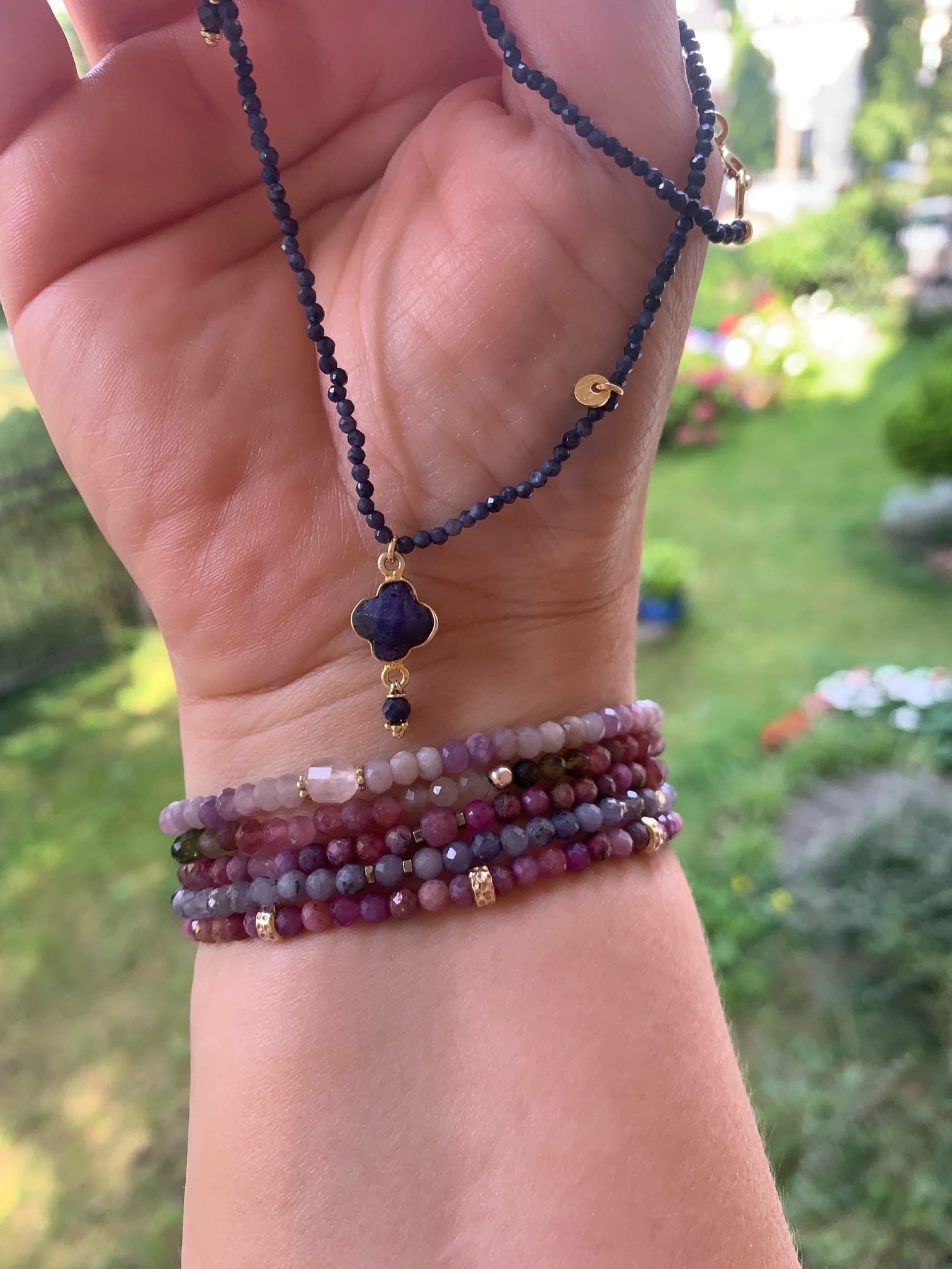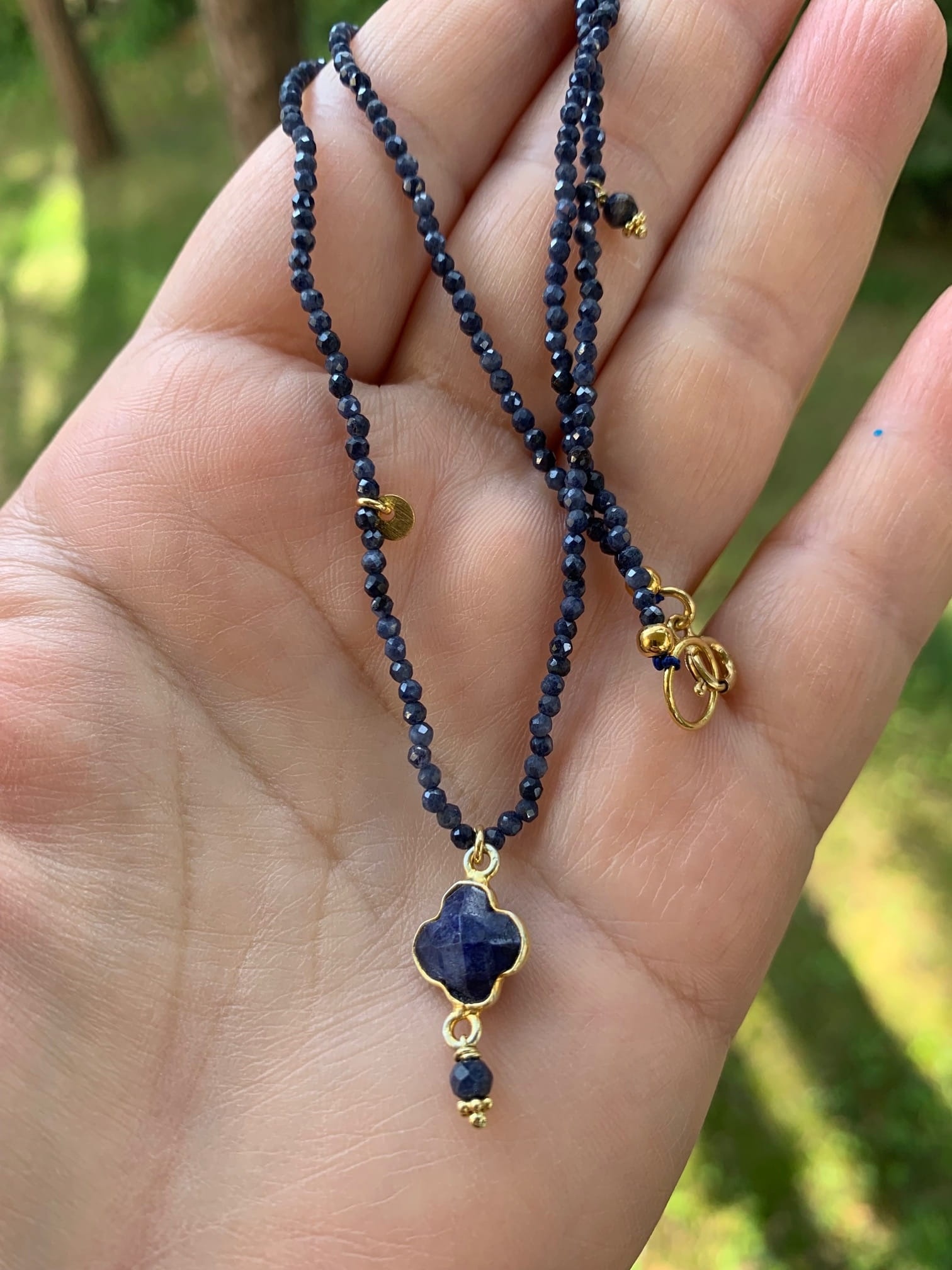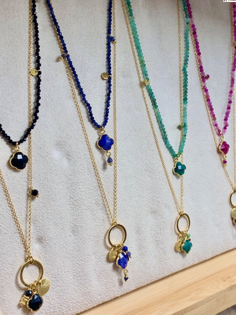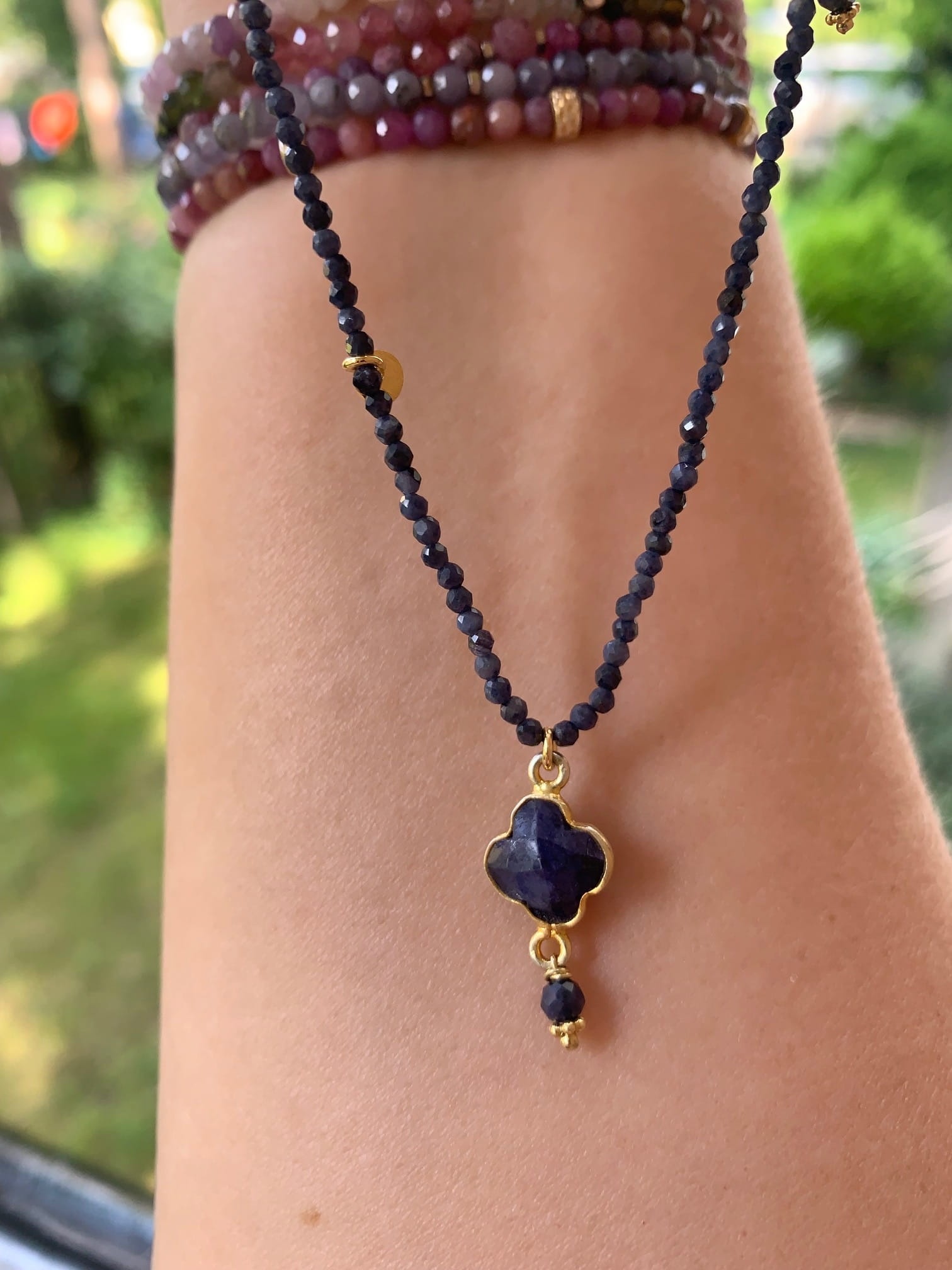 Naszyjnik z kamieni naturalnych z zawieszką w kształcie koniczyny z szafiru. Ozdobiony satynowymi blaszkami i kamyczkami. Wykończona logo La Boheme