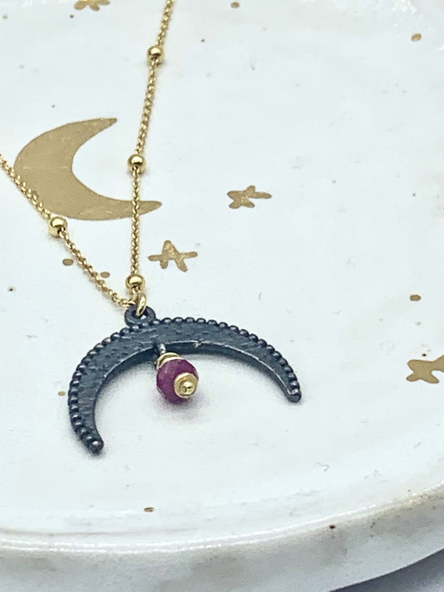 Naszyjnik z łańcuszka z kuleczkami  z zawieszoną filigranowa Lunulą Księżycem - słowniańskim symbolem kobiecości.