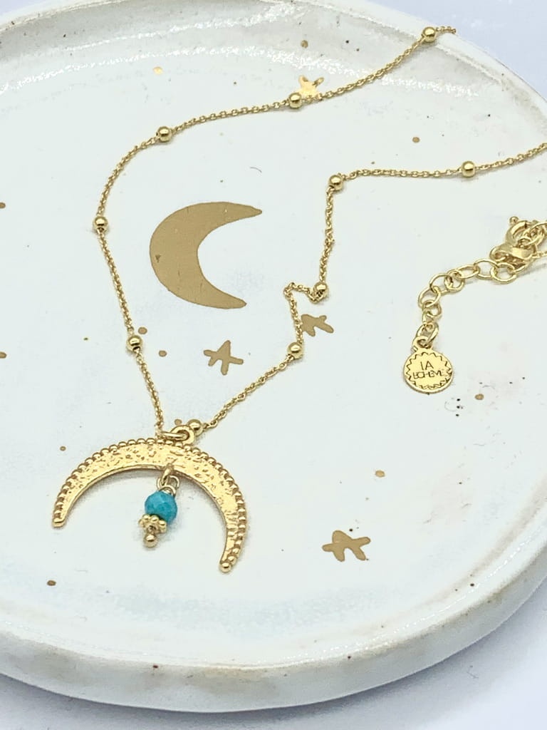 Naszyjnik łańcuszek z kuleczkami Lunula Luna Księżyc turkus 40cm złocony